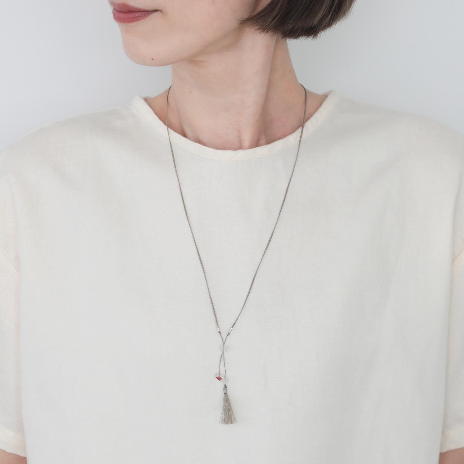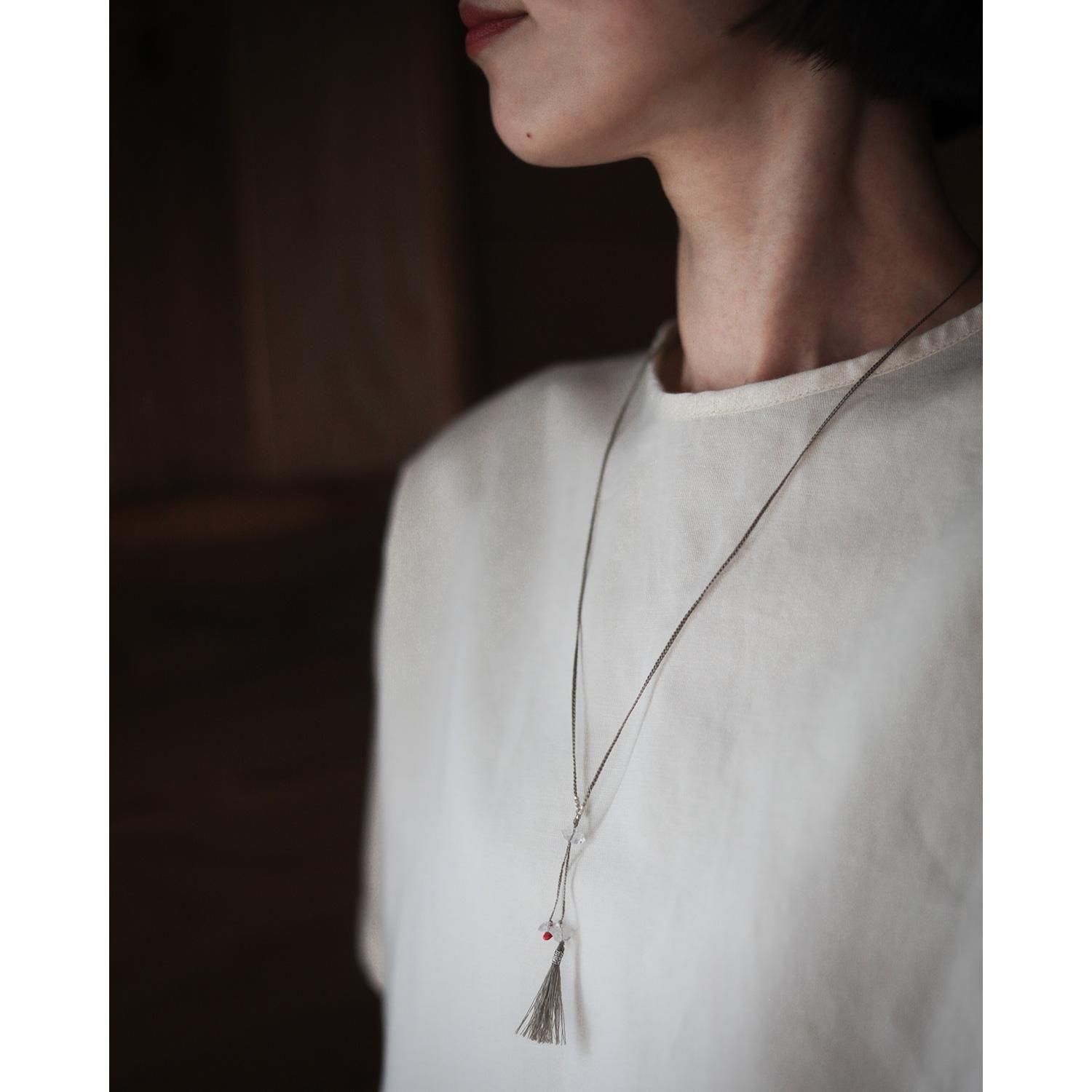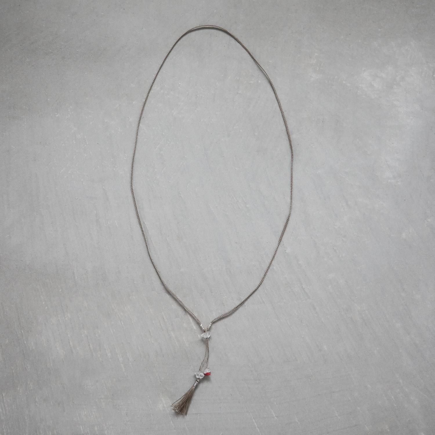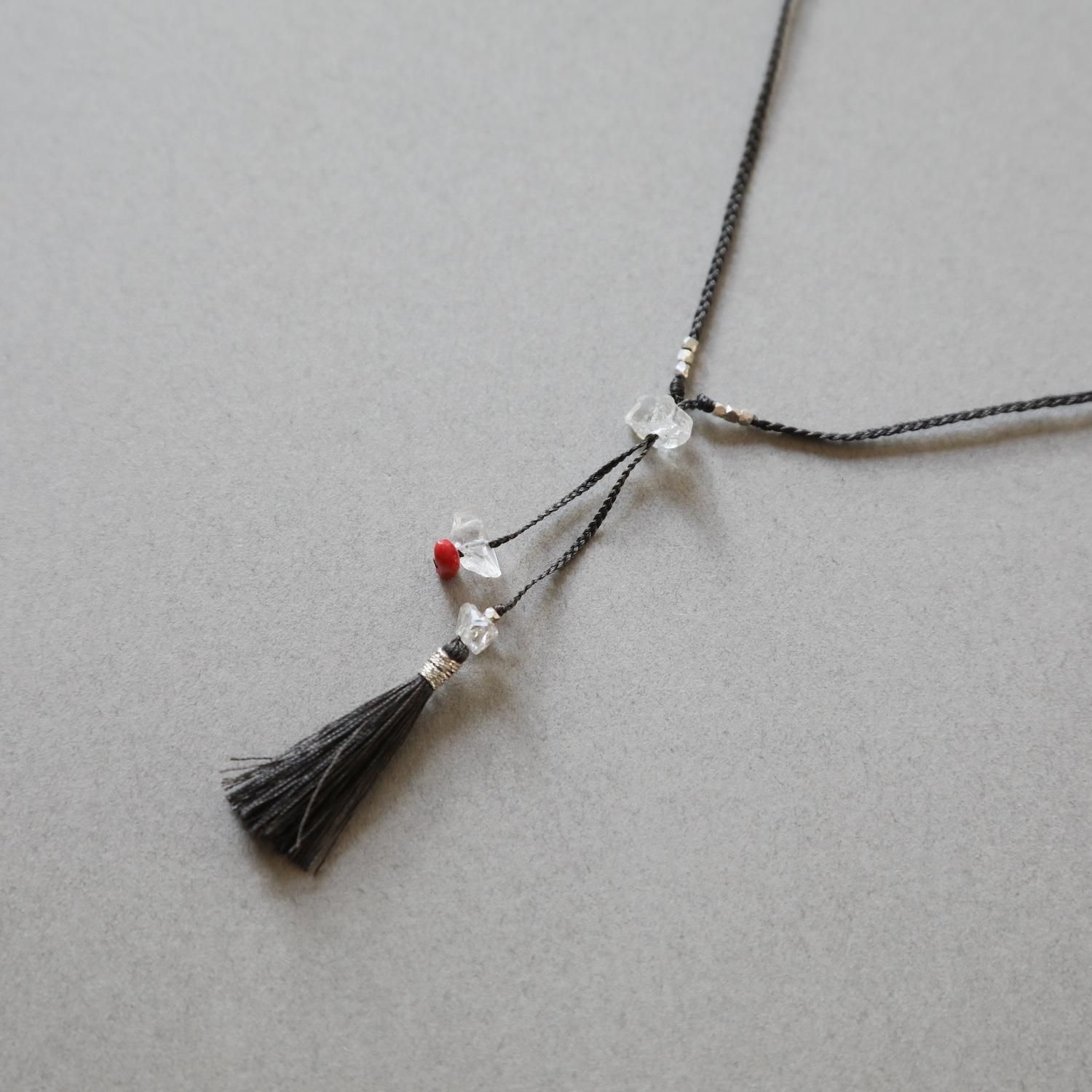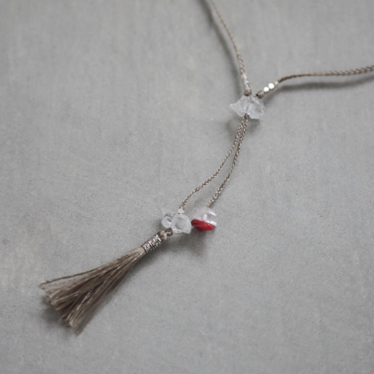 素材: 紐、天然石(ハーキマーダイヤモンド、珊瑚)、カレンシルバービーズ