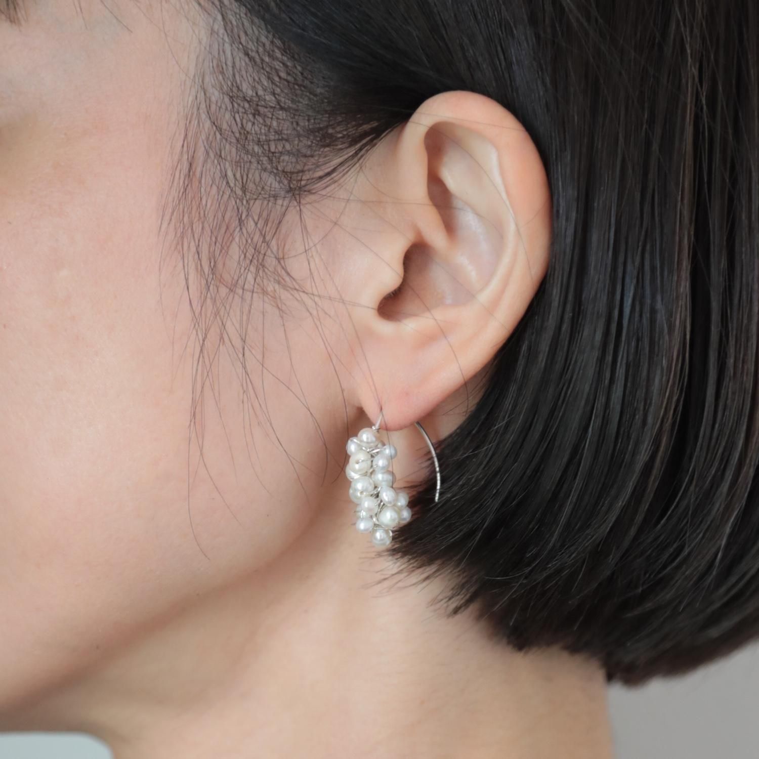 小さな淡水パールの粒が連なる、上品で落ち着いた印象のシルバーピアスです。