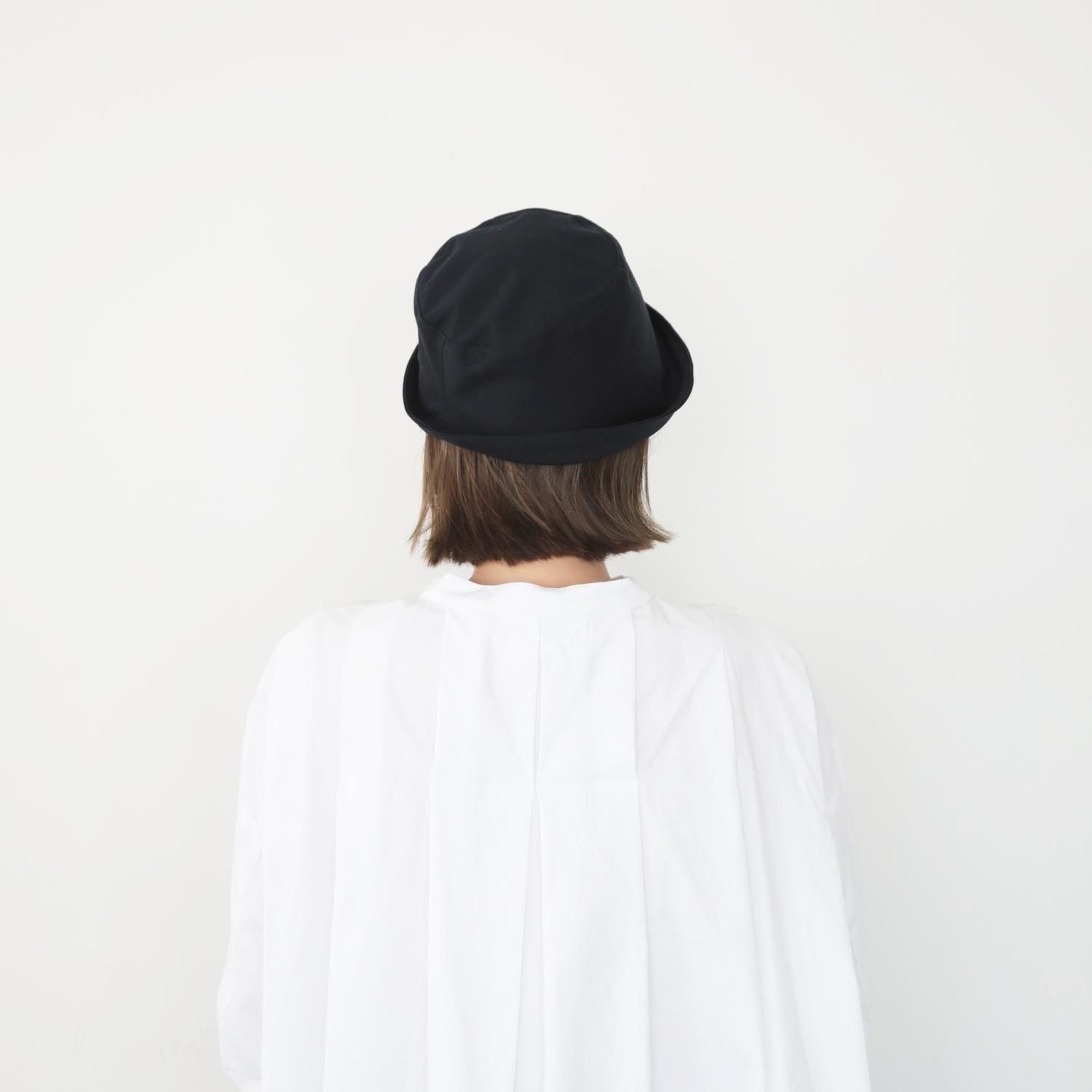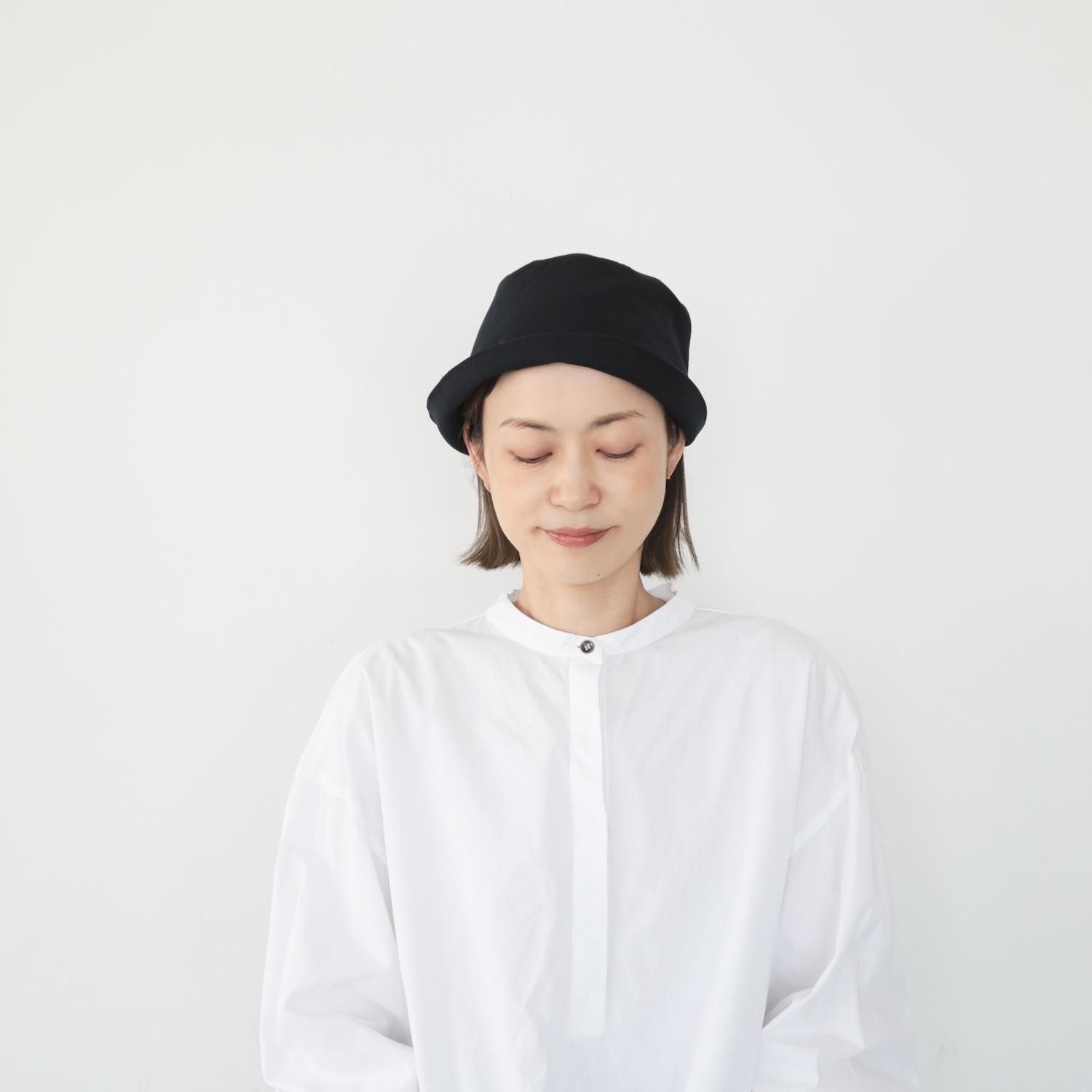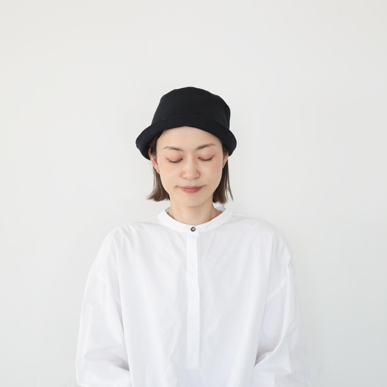 ポークハットの特徴である、低く平らなクラウン(頭の部分)と、くるんと上がった狭めのブリム(つば)をバケツ型にアレンジ。クラウンとブリムの境目がなく、自然な丸みのあるフォルムが魅力です。