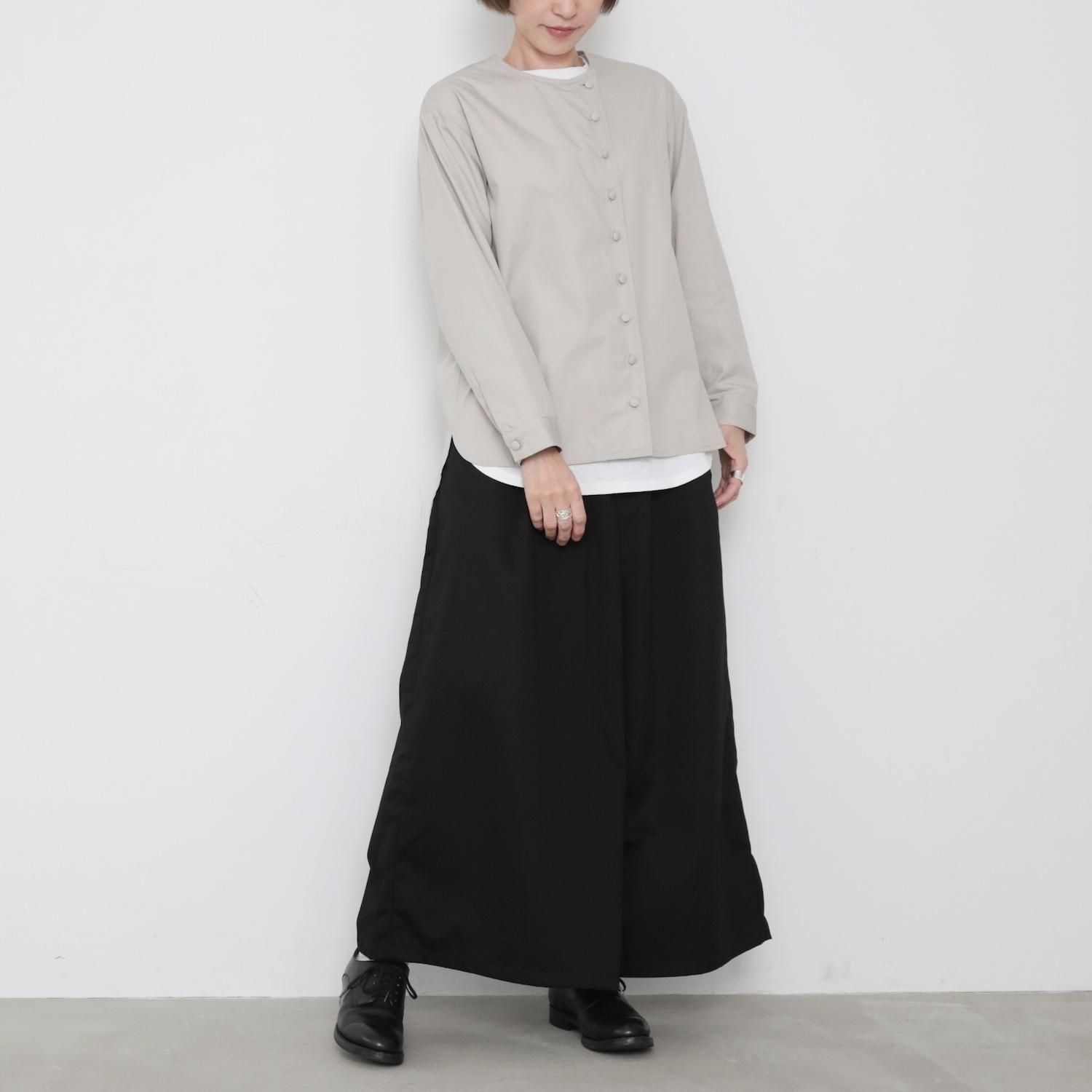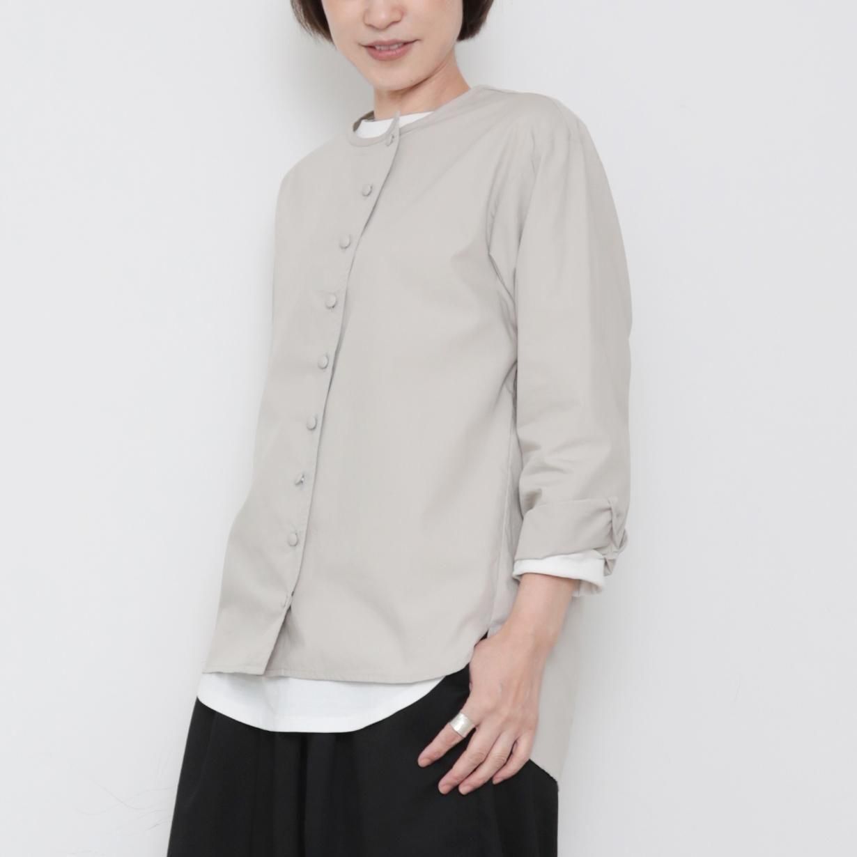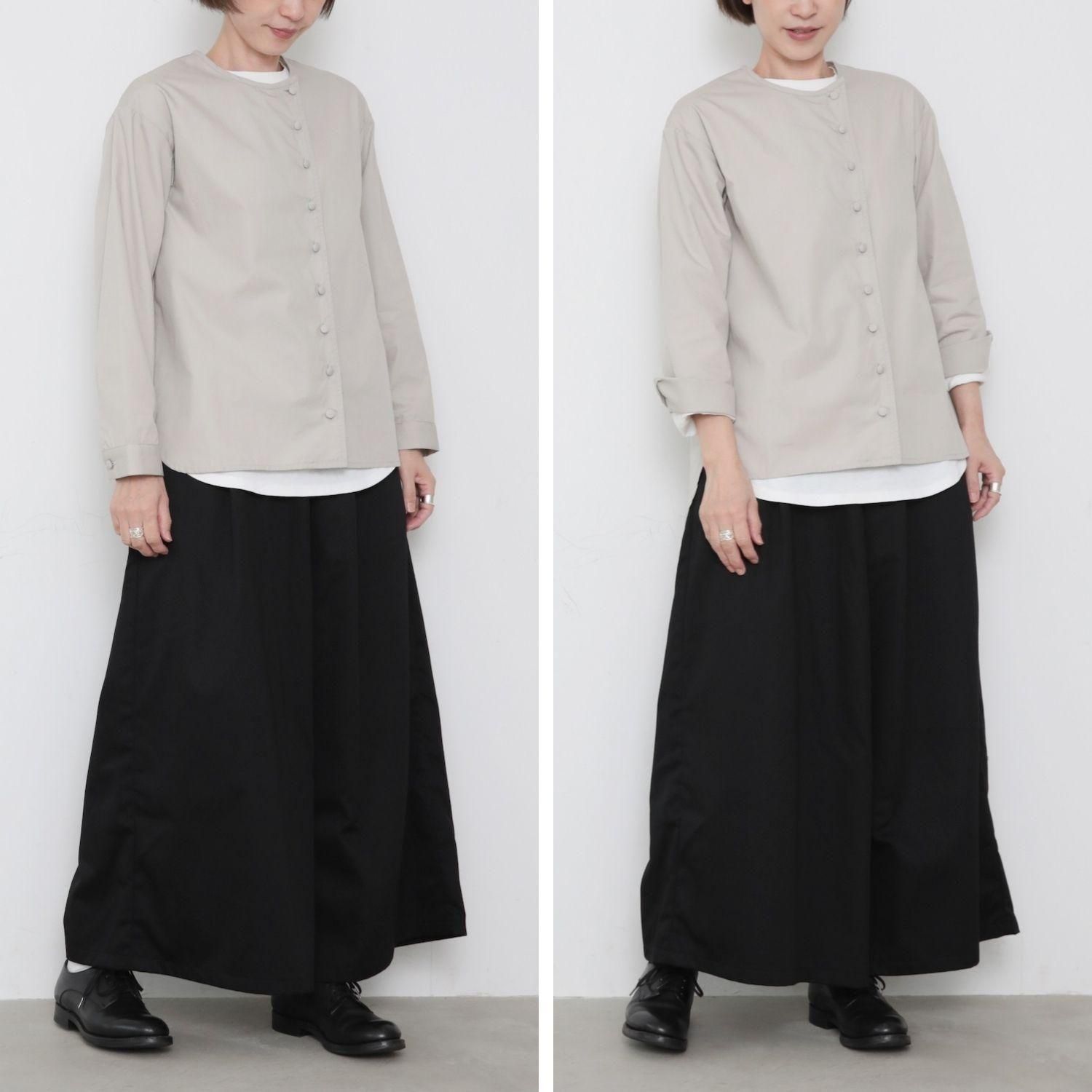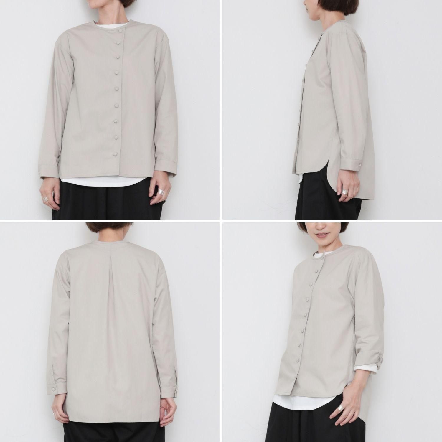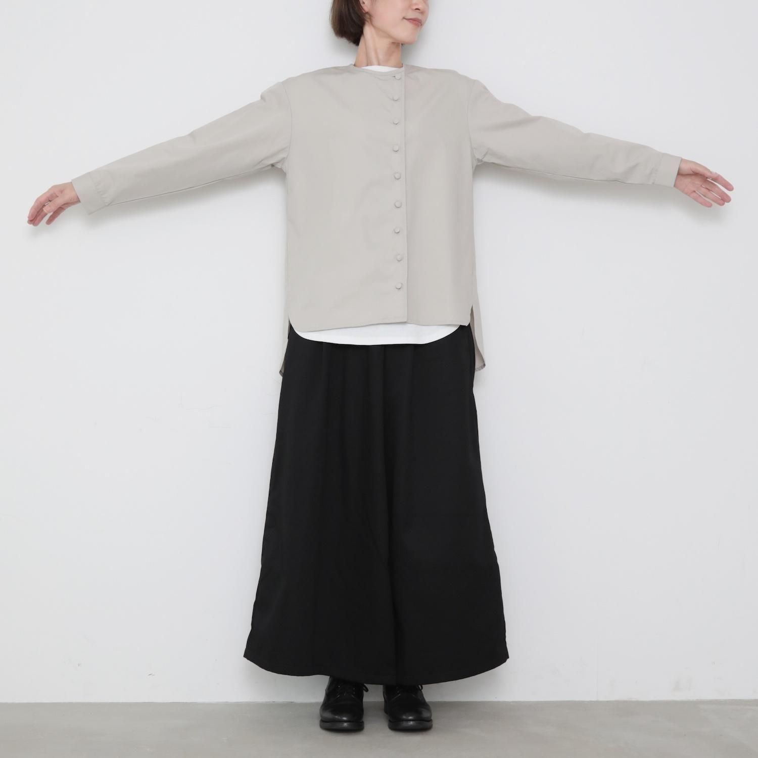ストールを巻く機会が増える季節に合わせて、襟元はノーカラーに。