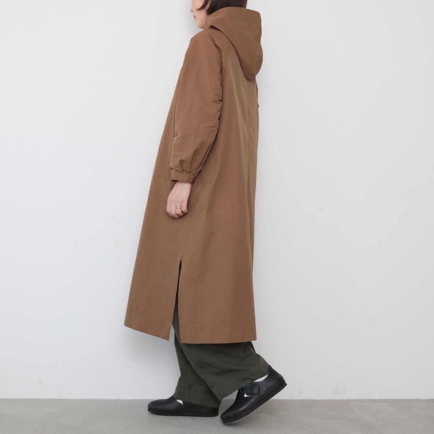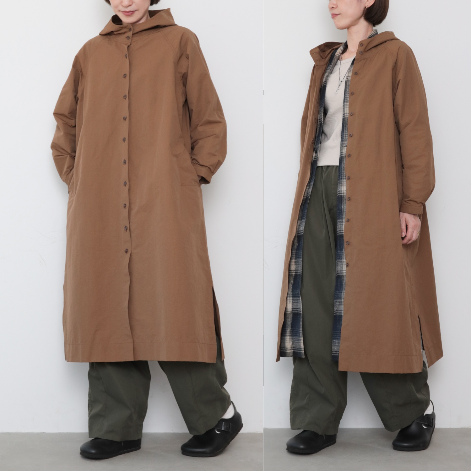 フード付きのデザインがほどよいカジュアル感を添え、さっと羽織るだけで雰囲気のあるスタイルに仕上がります。