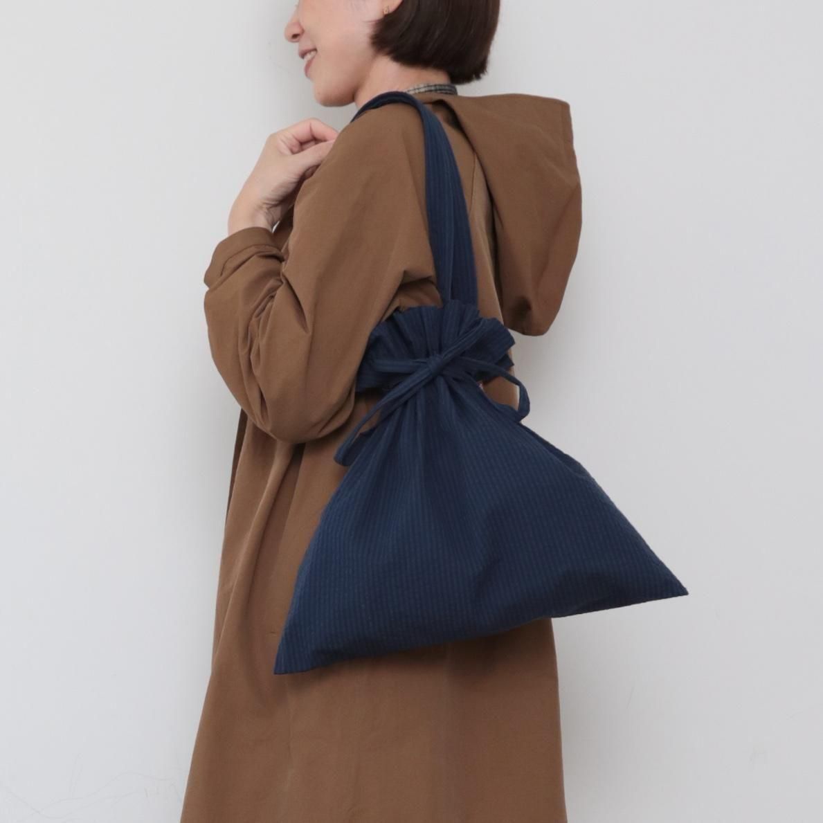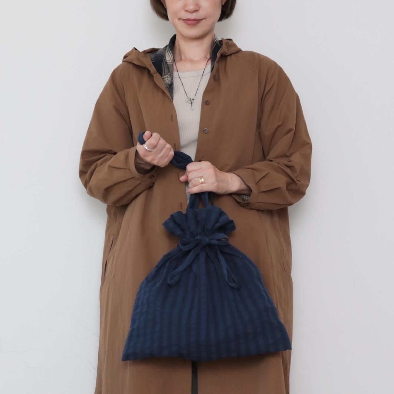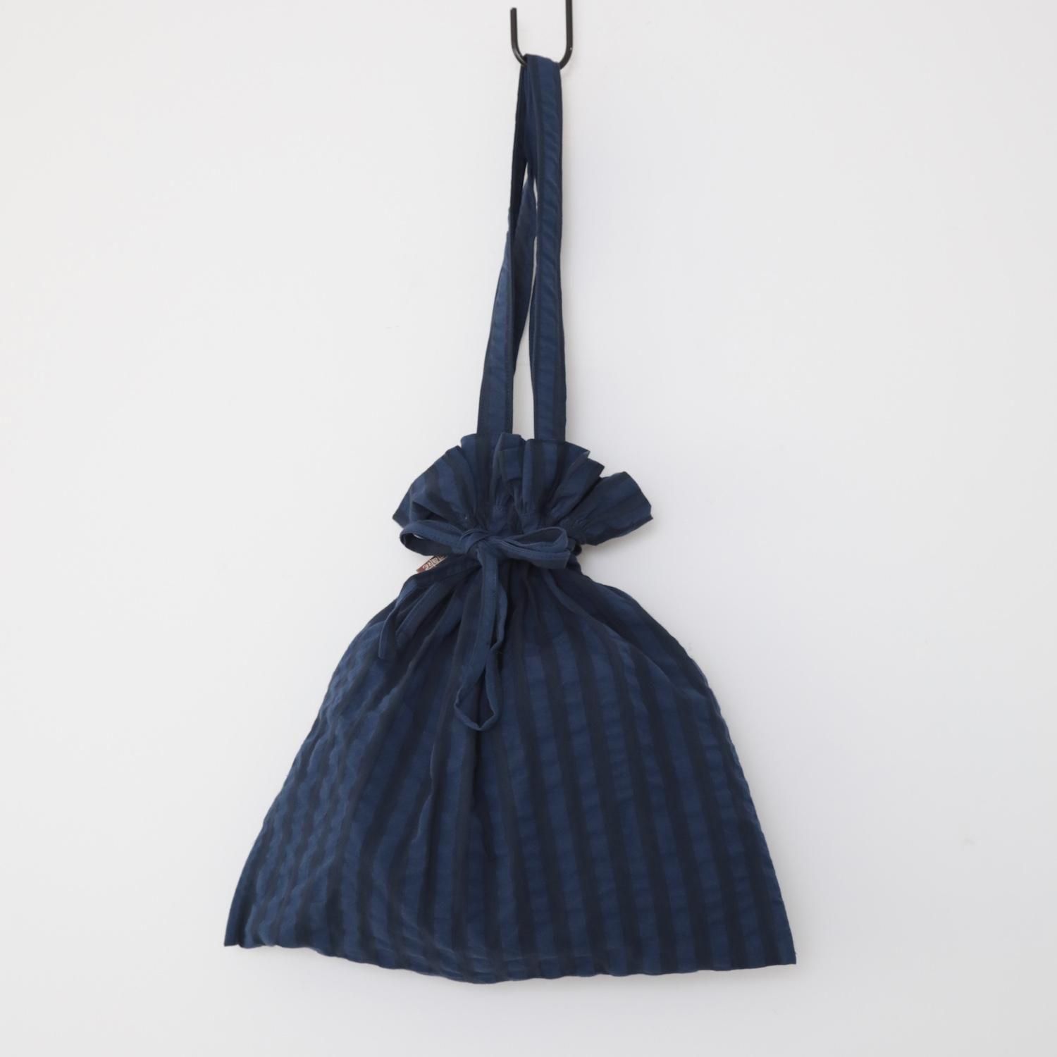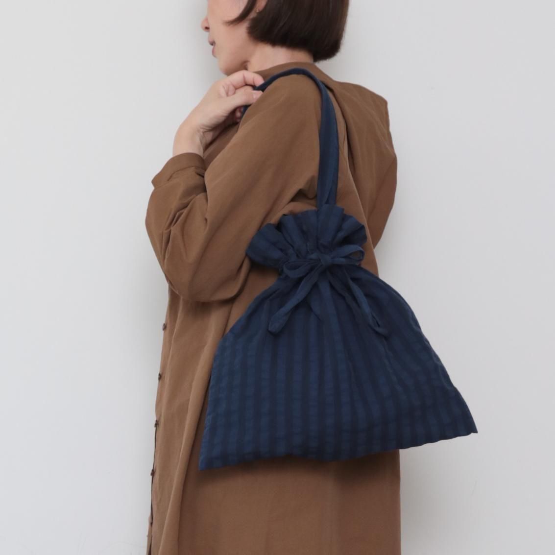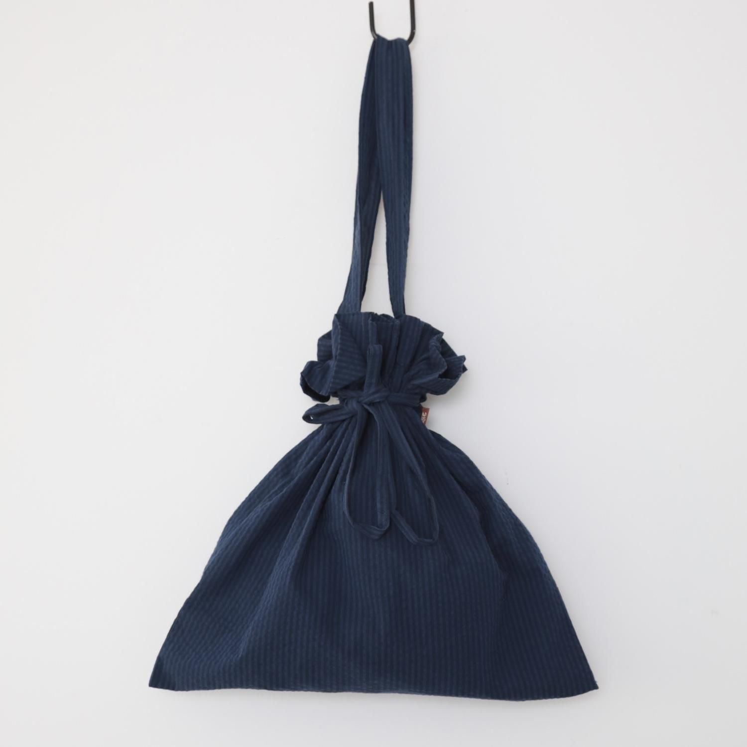 紐を絞ると、口もとにふんわりとフリルが表れる巾着型のバッグです。