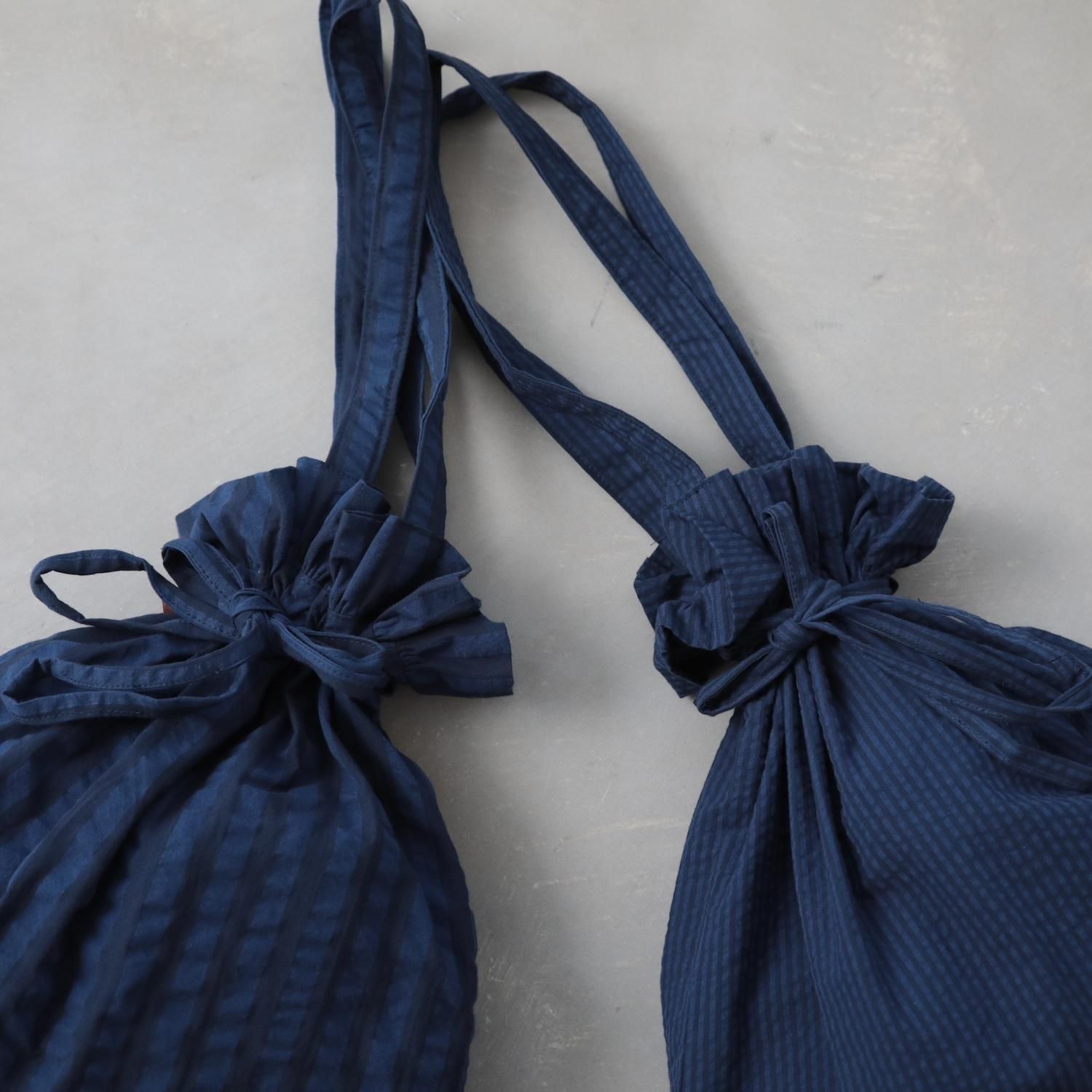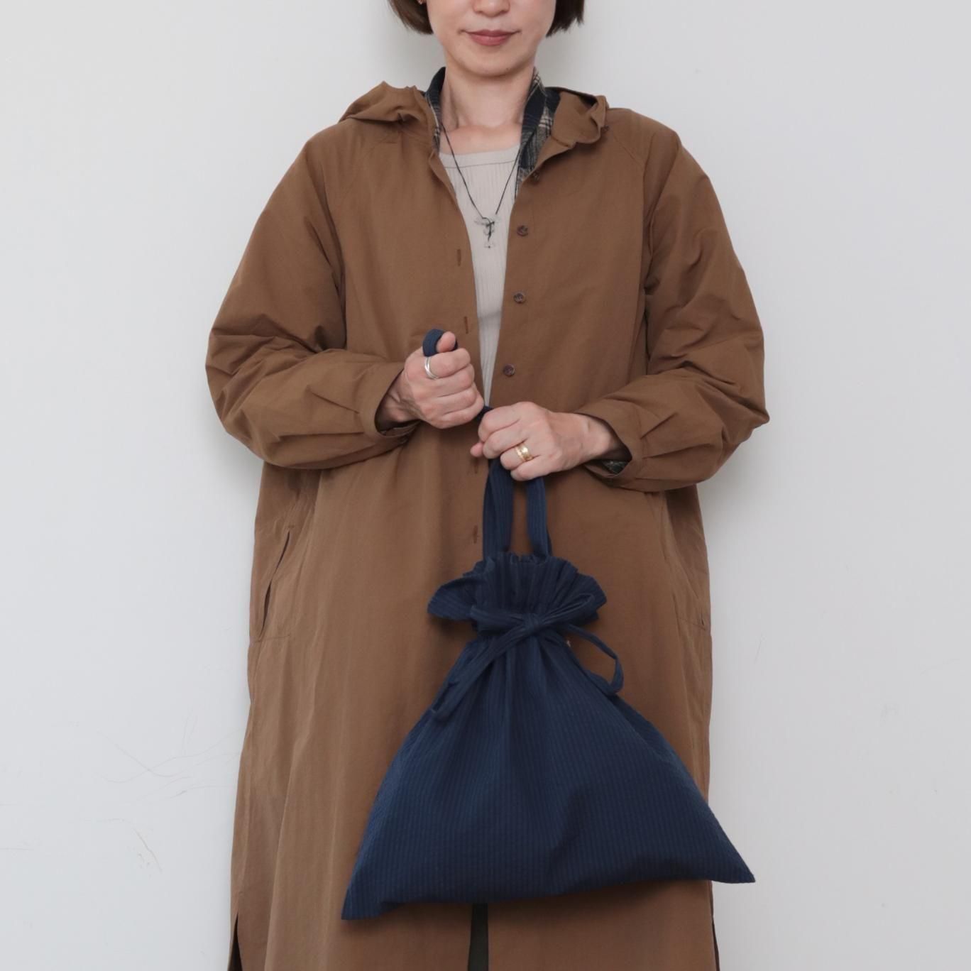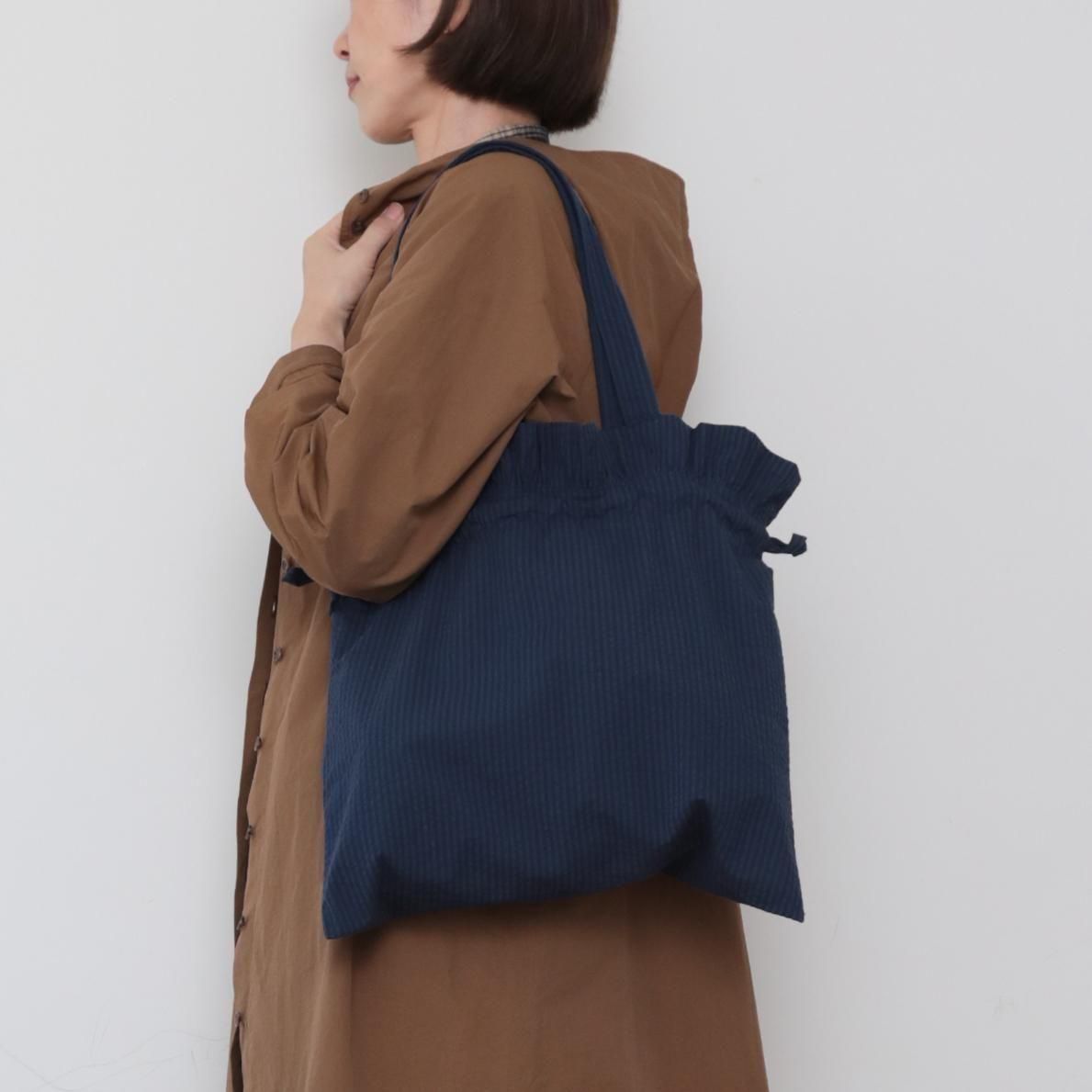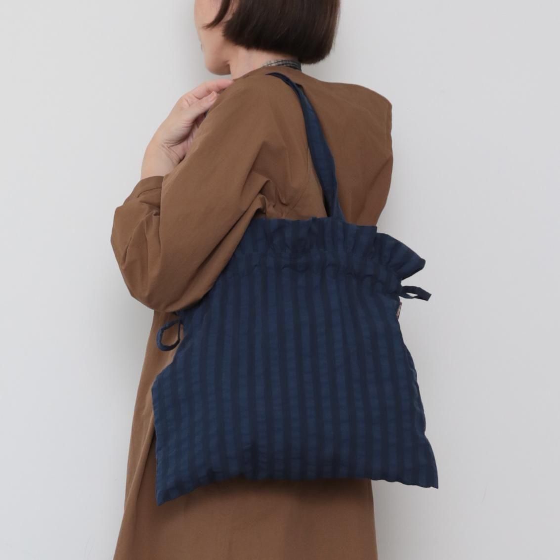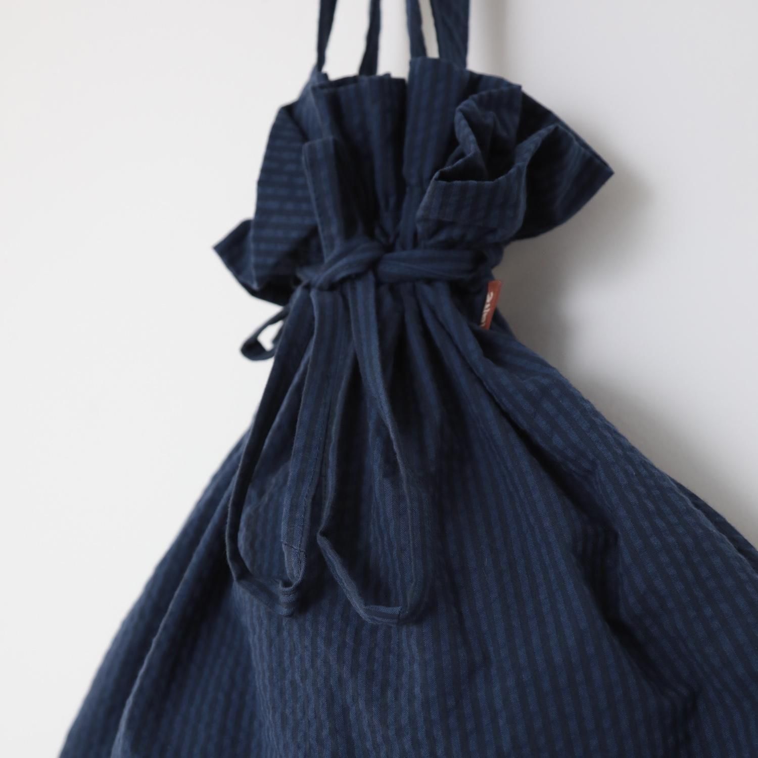 紐を絞ると、口もとにふんわりとフリルが表れる巾着型のバッグです。