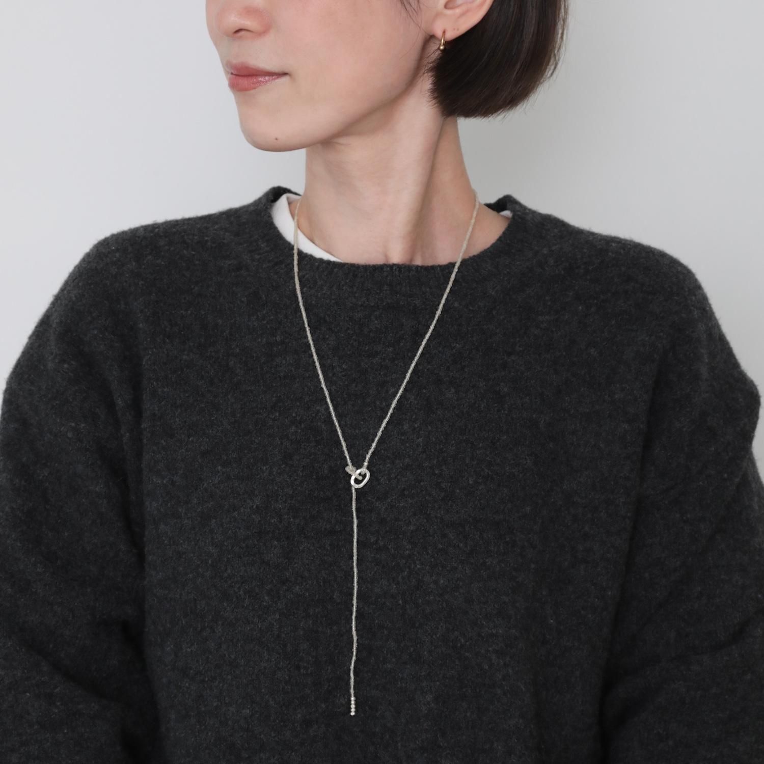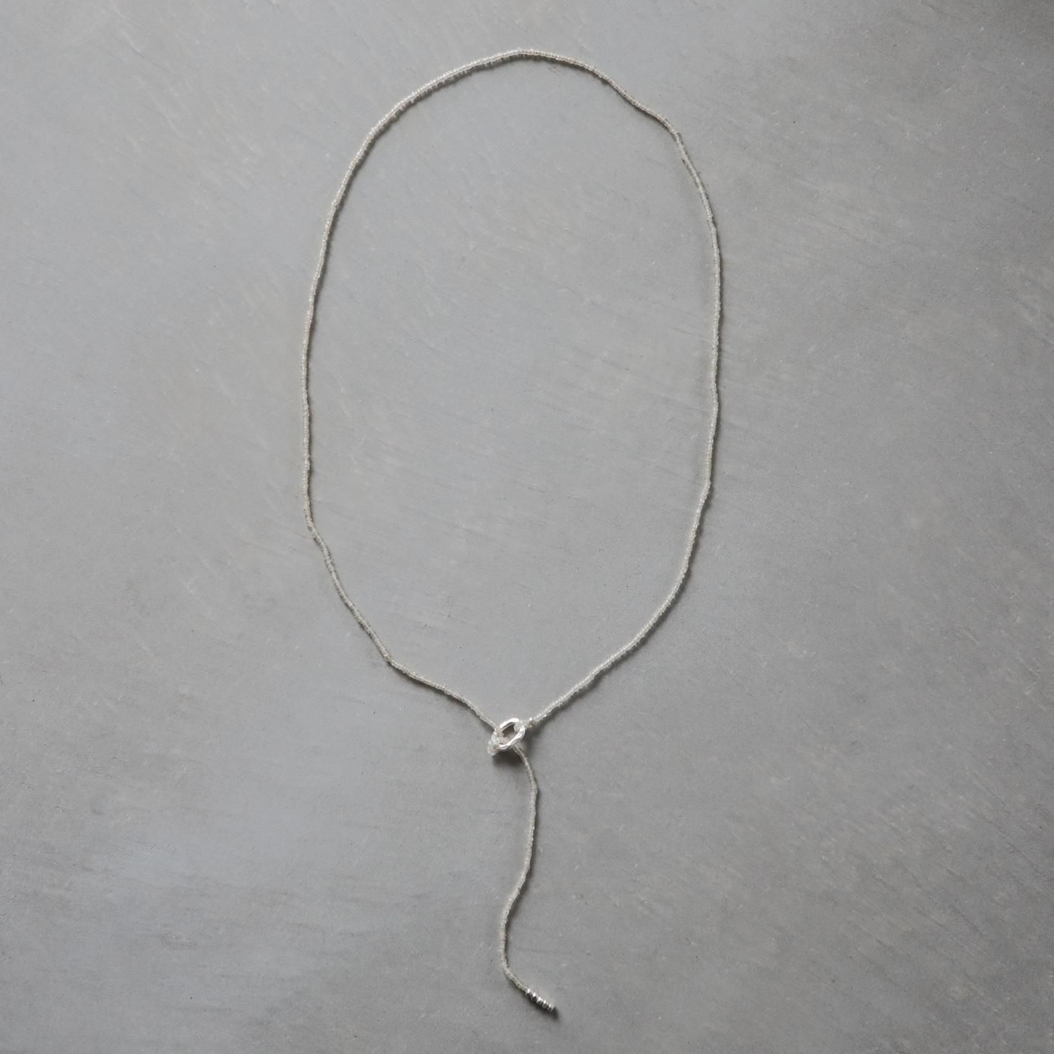 一本の紐状になっており、先端をシルバーの輪に通して結ぶ仕様です。お好きな長さに調節できるので、コーディネートや気分に合わせて幅広くお楽しみいただけます。