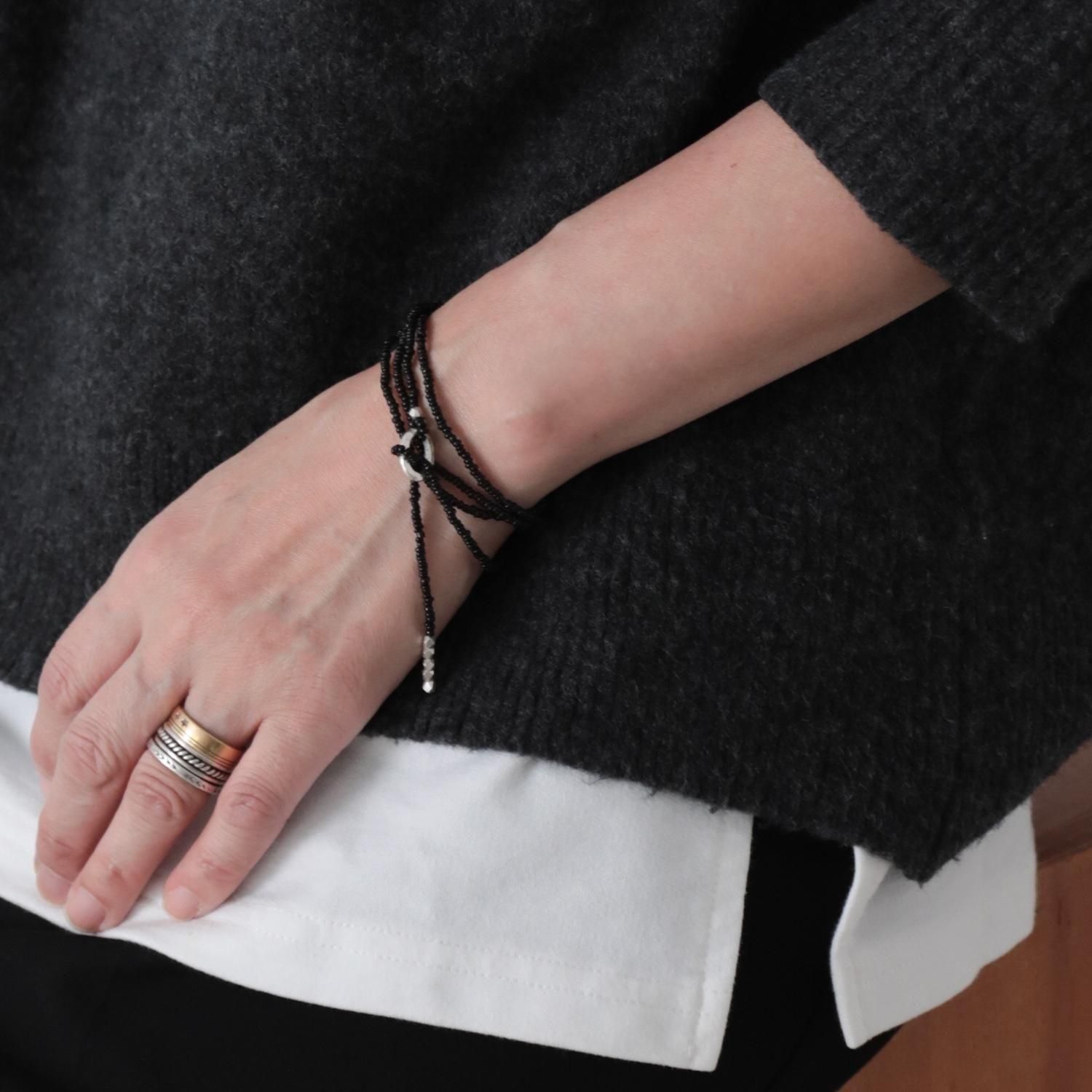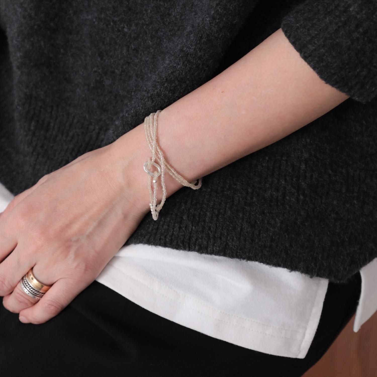 シンプルなのに存在感があり、長めのネックレスとしてはもちろん、手首にぐるぐる巻いてブレスレットにしても素敵。さりげなく個性をプラスしてくれる、使い勝手のよいアイテムです。